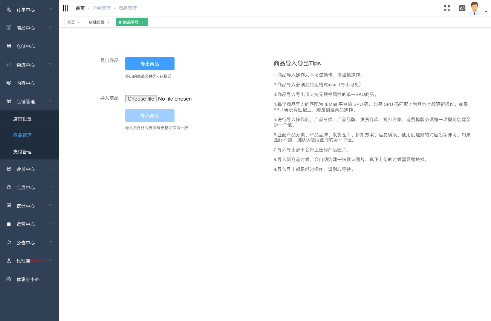 - 导入导出商品列表, 请确保文件格式为xlsx. 此操作为不可逆