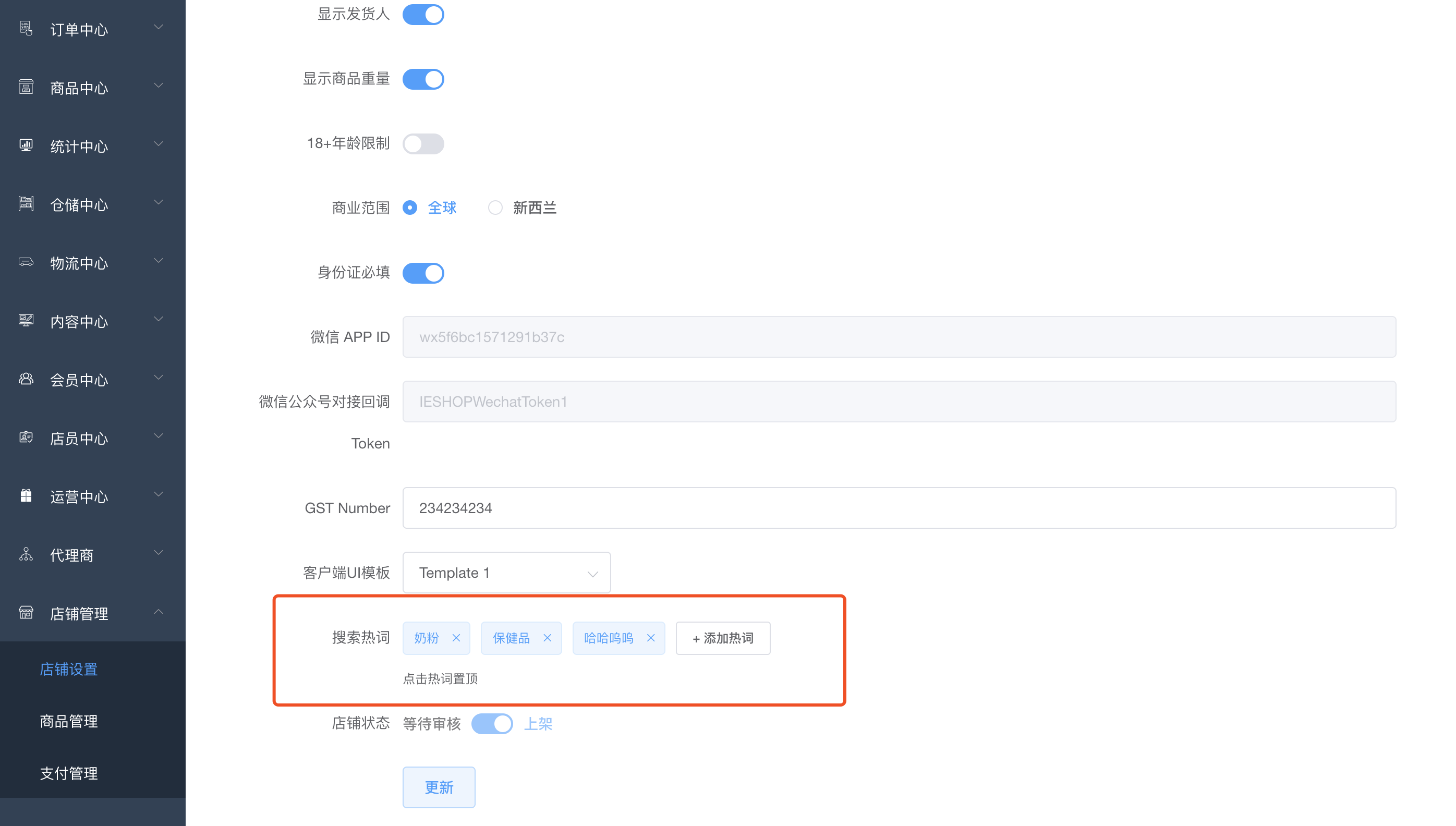 在“店铺设置”里可以设置显示在PC端搜索框下面的搜索热词